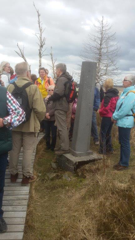 Nach dem Mittagessen unternahmen wir noch eine kurze Wanderung durch das Hochmoor, eine schildförmig gewölbte Hochfläche. Wir liefen über angebrachte Holzstege und konnten u.a. viele Frösche sehen und die wunderschöne Landschaft bewundern. Dieter erzählte uns eine ganze Menge über Fauna und die Geschichte der Region.