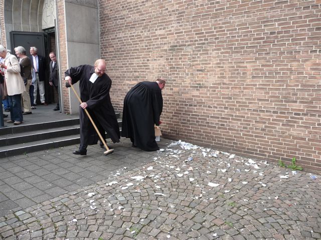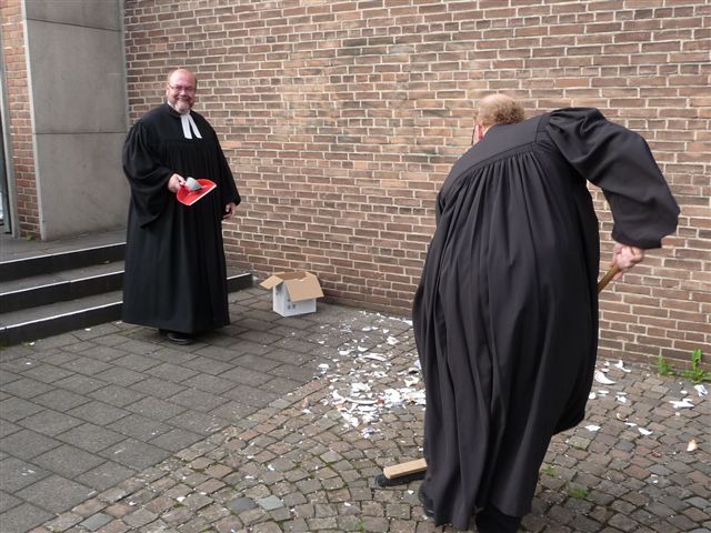 Der Bedeutung des Anlasses angemessen, fand am Vorabend in der Christuskirche in Saarn der Polterabend in Form eines Funktionsgottesdienstes statt. Und gepoltert wurde tatsächlich! Im Anschluss an den sehr gut besuchten Gottesdienst wurde – wie es sich gehört – draußen neben dem Eingangsportal allerlei mitgebrachtes Porzellan zerdeppert und sodann unter den beifälligen Blicken der Kirchgänger von den beiden Pastoren Hillebrand und Ruddat fachgerecht zusammengekehrt.