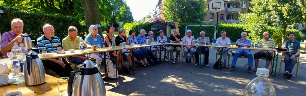 Am 3.7.18 trafen sich die Orgateams der Netzwerke Broich und Saarn im Garten vor dem Jugendraum des Gemeindehauses Broich zu Kaffee und Kuchen und einem Austausch über die jeweiligen Gruppenaktivitäten. Svijetlana Stefanac hatte diese Zusammenkunft vorbereitet und begleitete die Teilnehmer in der Diskussion.