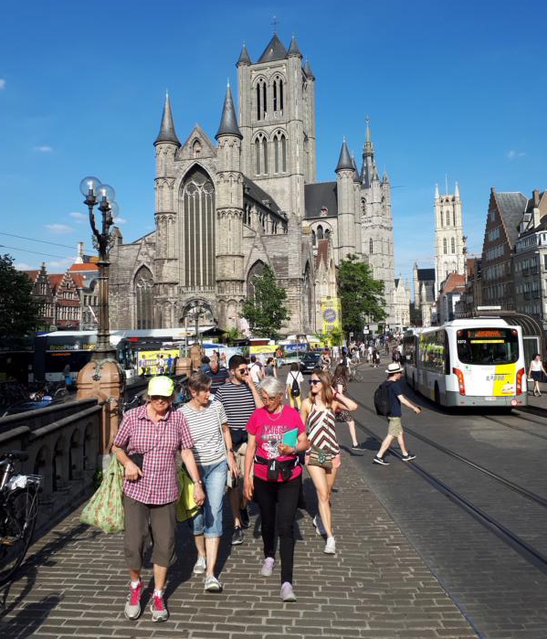 Weitere Stationen der Reise waren Diest, Mechelen, Belare, Gent und schließlich Brügge. Diese Städte haben überwiegend mittelalterliche Bebauungskerne. Hinzu kommen oft innerstädtische Kanalsysteme, die teilweise durch Passagierboote erschlossen sind. Leider reichte unsere Zeit nicht für eine Grachtenrundfahrt. Doch dafür wartete in Brügge eine Stadtführerin auf uns, die nicht die übliche Führung zu den von Touristen überlaufenen Sehenswürdigkeiten anbot, sondern uns zum Beispiel zu den Beginenhöfen führte. Beginen sind in einer klösterlichen Gemeinschaft lebende, aber nicht durch ein Gelübde gebundene, zum Teil wohlhabende Frauen. Noch heute werden die Tore der Höfe abends verschlossen und erst am Morgen wieder geöffnet. Männer haben während der Nacht keinen Zutritt. Heute wird der älteste Beginenhof aus dem 13. Jahrhundert von Schwestern des Benediktinerinnenordens und alleinstehenden Frauen aus Brügge bewohnt.