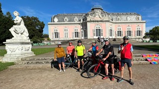 Am Sonntag traten wir dann bei herrlichem Wetter unsere Heimreise an, die uns zunächst nach Zons führte. Da es noch früh am Tag war, konnten wir das idyllische Städtchen in Ruhe besichtigen. Nach unserer Runde durch das Dorf nahmen wir die Fähre über den Rhein. Der ausgesuchte Radweg erwies sich als sehr idyllisch. Zunächst erreichten wir Schloss Benrath. Die pastellfarbene Fassade des Schlosses erstrahlte förmlich vor dem Hintergrund des tiefblauen Himmels. Wir trafen dort auf einen netten Zeitgenossen, der sichtlich Freude daran hatte, uns zu fotografieren. Da er mit zwei älteren Damen unterwegs war, freute er sich wohl über die unterhaltsame Abwechslung, unsere doch „viel jüngere“ aktive Gruppe abzulichten. Nachdem wir noch den wunderschönen Dahliengarten bewundert hatten, ging es dann weiter zum Elbsee, ebenfalls ein Naturparadies. Nachdem wir dann den Unterbacher See noch kurz passiert hatten, ging es weiter Richtung Grafenberg, immer wieder über schöne Radwege im Grünen. Unsere Mittagspause und letzte gemeinsame Einkehr fand dann in Ratingen auf dem Marktplatz statt. Nachdem uns im Café Extrablatt verboten wurde, 2 Tische für 6 Personen zusammenzustellen, sind wir dann gleich zur Konkurrenz nebenan gegangen und wurden dort bestens bedient. Nach unserer Rast ging es dann endgültig heimwärts.