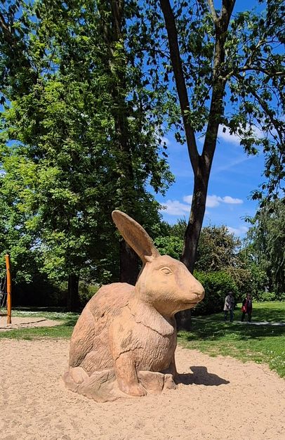 Auf der anderen Seite der Bahnstrecke liegt recht versteckt das Hasental – so getauft von den Kindern der benachbarten Grundschule. Eine monumentale Hasenfigur und Spielgeräte sind Anziehungspunkte für die Kinder und ihre Eltern.