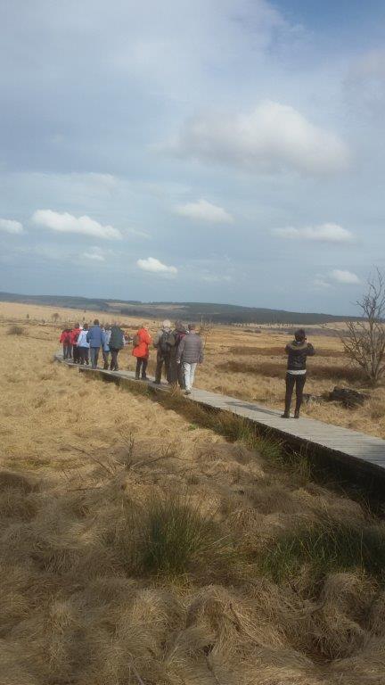 Nach dem Mittagessen unternahmen wir noch eine kurze Wanderung durch das Hochmoor, eine schildförmig gewölbte Hochfläche. Wir liefen über angebrachte Holzstege und konnten u.a. viele Frösche sehen und die wunderschöne Landschaft bewundern. Dieter erzählte uns eine ganze Menge über Fauna und die Geschichte der Region.