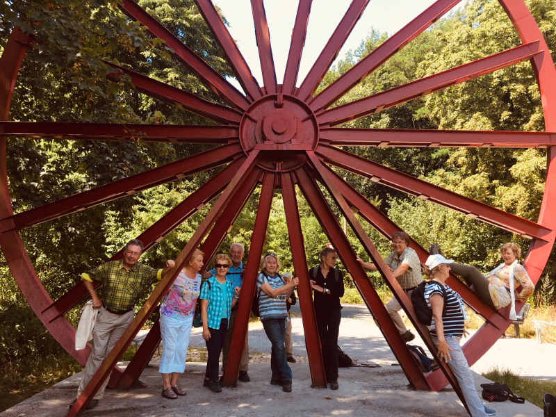 Ein fotogener Halt war die riesige Ablenkseilscheibe vom Förderturm der ehemaligen Zeche Pörtingsiepen. Sie steht zur Erinnerung an den hier bis 1972 betriebenen Bergbau.