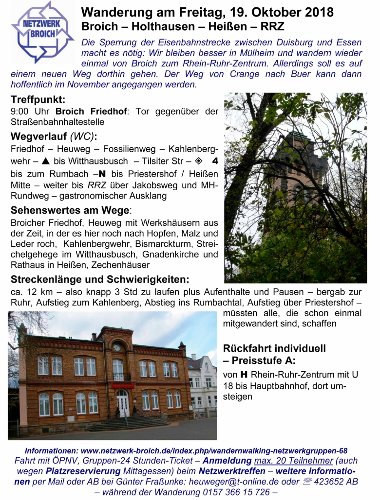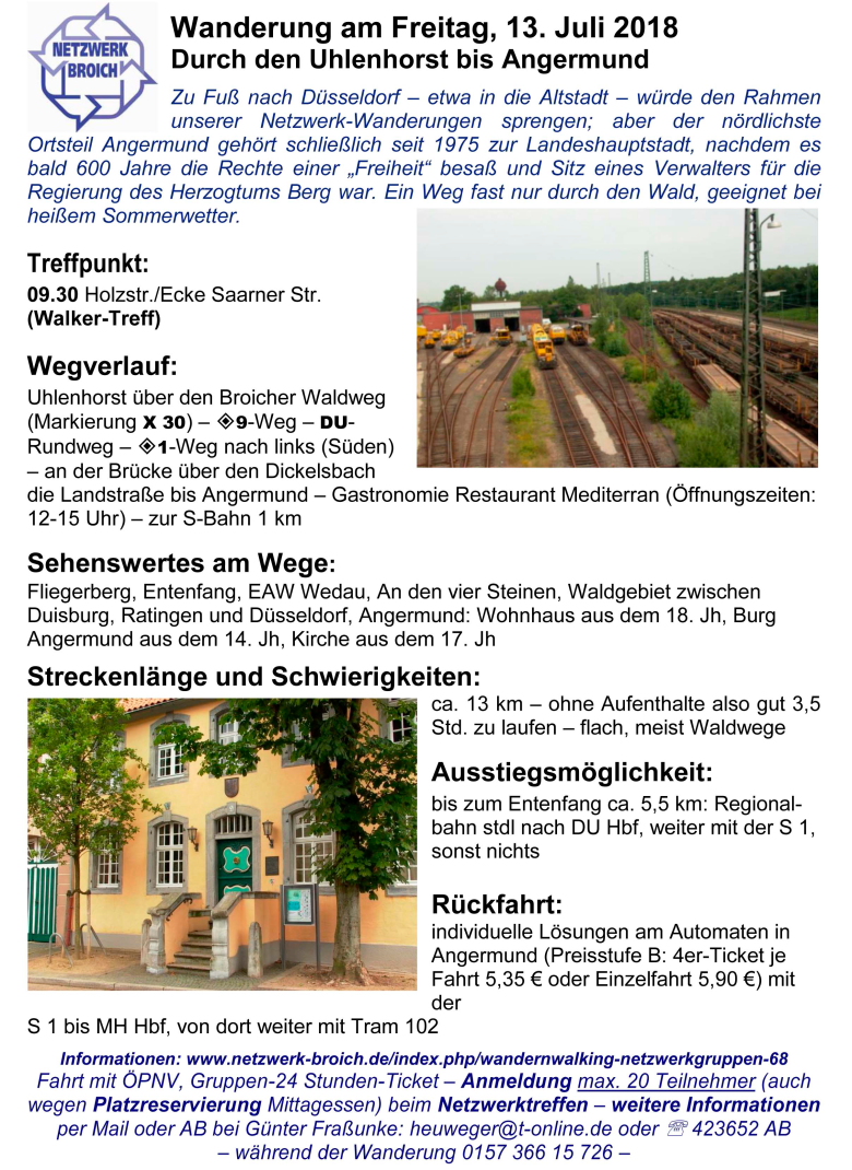 - Informationsmöglichkeiten des Netzwerks Broich nach Möglichkeit nutzen: Newsletter / Homepage https://www.netzwerk-broich.de/index.php/netzwerk-gruppen/wandern