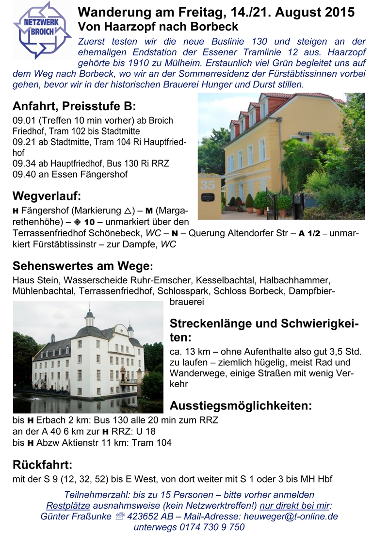 zur Veröffentlichung in der Homepage des Netzwerks ist automatisch Bestandteil der Anmeldung. - Ansprechpartner und Anmeldung persönlich bei Günter Fraßunke im Anschluss an das Netzwerktreffen (wenn es vor dem Wandertermin liegt), per Mail Diese E-Mail-Adresse ist vor Spambots geschützt! Zur Anzeige muss JavaScript eingeschaltet sein! oder SMS 015736615726 oder Festnetz 0208 423652 AB, – restliche freie Plätze erfragen