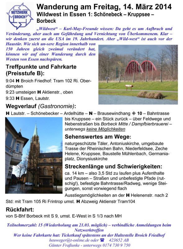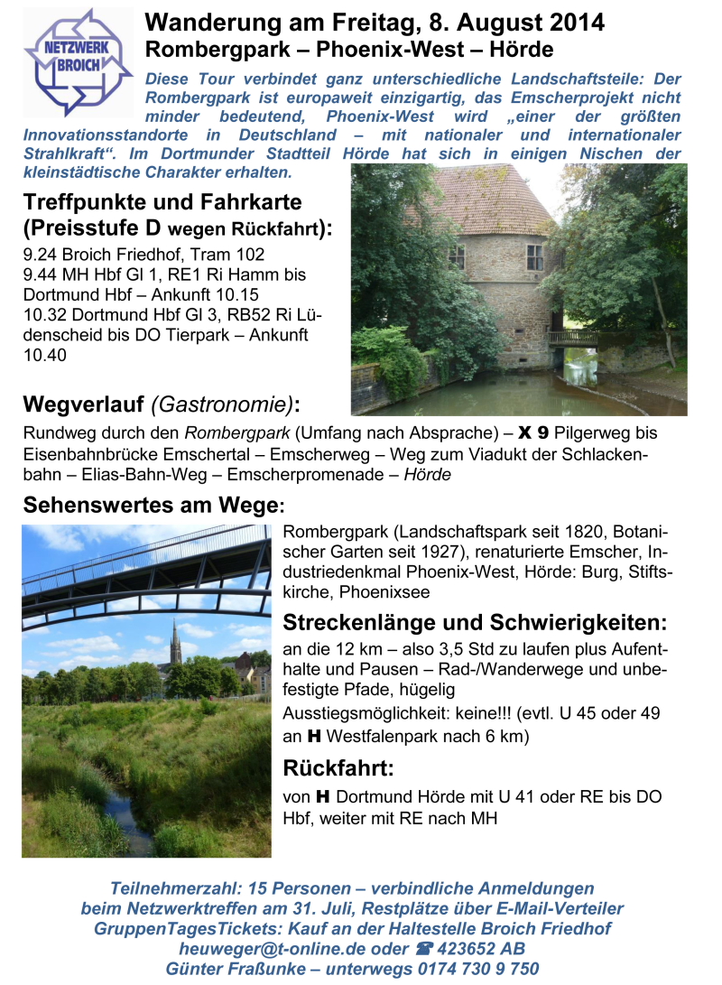 • Ansprechpartner und Anmeldung persönlich bei Günter Fraßunke im Anschluss an das Netzwerktreffen (wenn es vor dem Wandertermin liegt), per Mail Diese E-Mail-Adresse ist vor Spambots geschützt! Zur Anzeige muss JavaScript eingeschaltet sein! oder SMS 015736615726 oder Festnetz 0208 423652 AB, – restliche freie Plätze erfragen