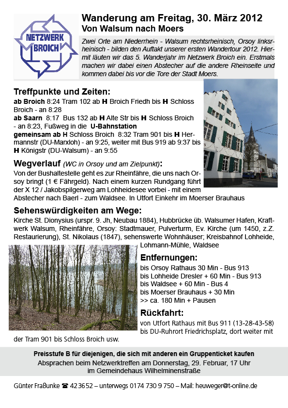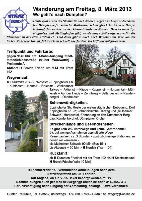 - Startbedingungen: Ankündigung der nächsten Wanderung auf der Homepage des Netzwerks Broich und beim Netzwerktreffen, Begrenzung auf 16 Teilnehmer, Fahrten mit dem ÖPNV, bitte Fahrkarten individuell besorgen, Abweichungen (anderer Zustieg in Tram/Bus, keine Teilnahme am Mittagessen) vorher mitteilen, Teilnahme auf eigene Gefahr, Einverständniserklärung zu fotografischen Aufnahmen